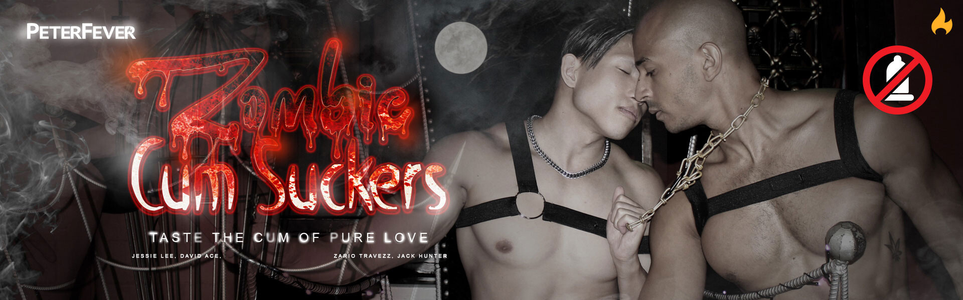 That couple is (Grabbys winner for "Best Newcomer") Jack Hunter and his partner David Ace. The unwitting pair get a mysterious sex party invite entitled "Cum Into My Web" and find themselves playing cat and mouse in a fateful foursome with Jessie and Zario. David spots Zario in a hot fetishy shredded outfit, gold slave chain and leather cap, and gets his sexual motor revved up for action. In the sling room Zario pounds David's happy hole while Jack peeks through a slightly open door. When Zario's sperm drizzles into David's hungry mouth, Jack watches in horror as his love turns into a sex-driven zombie. He rushes to search on his phone for the secret of "How to turn a zombie human again." When the answer states that only by feeding the King the "cum of pure love" can you defeat him and turn all his minions back to their human form, he knows it's all up to him.