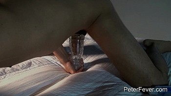 My thoughts are of you; do you want to fuck me or can I have you? My body is filled with fantasies as I sense you next to me. Feeling my cock in my silk bottoms, I close my eyes and strip to my strap. My meat bulges as I take everything off; I want your lips wrapped around my shaft. Using a toy, I slide in, just like I do to you. The tight sensation has me moan and I remember just how good you feel when I am on top. In control, my girth spreads you further; I can smell your scent in the air while I edge. My sack undulates and I am close. Tugging faster, I see you in my mind; my body stiffens and I ejaculate onto my stomach. You are always in my thoughts. Ken Ott teases for PeterFever.com.