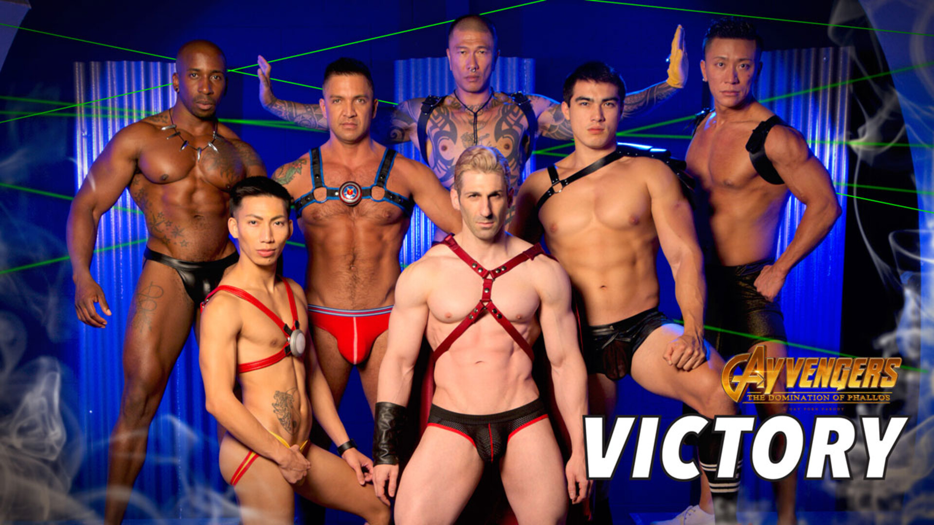 Bucky and Tony, the Man of Iron, burst in to Phallos' spaceship lair and confront the evil mastermind. But Phallos' mental power over the remaining Gayvengers has even these last holdouts captive of his control. Phallos commands the gayvengers to fuck for his entertainment and power, with Bucky and Tony the newest jewels on his gauntlet of mindfuck. Phallos and his minion watch and jerk off while the five Gayvengers grind their bodies and gonads together in a tight clusterfuck.