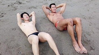 The sporty Asian fuckboys of PeterFever East have another athletic recreation under their belts. This time it's a beach outing that gets their sexual motors in gear. Muscular Ryuji jogs down the waterline with Fuji, then does a set of situps in the sand with his new bud. They dip into the cool spring waters of Japan and share a kiss. Back at home in the shower, they lather up each others' tight bodies with extra attention around the swelling crotches. Fuji's upright stiffy would be dangerous if he were a few inches taller and it poked up into topman Ryuji's asscrack, instead of between his muscular thighs.