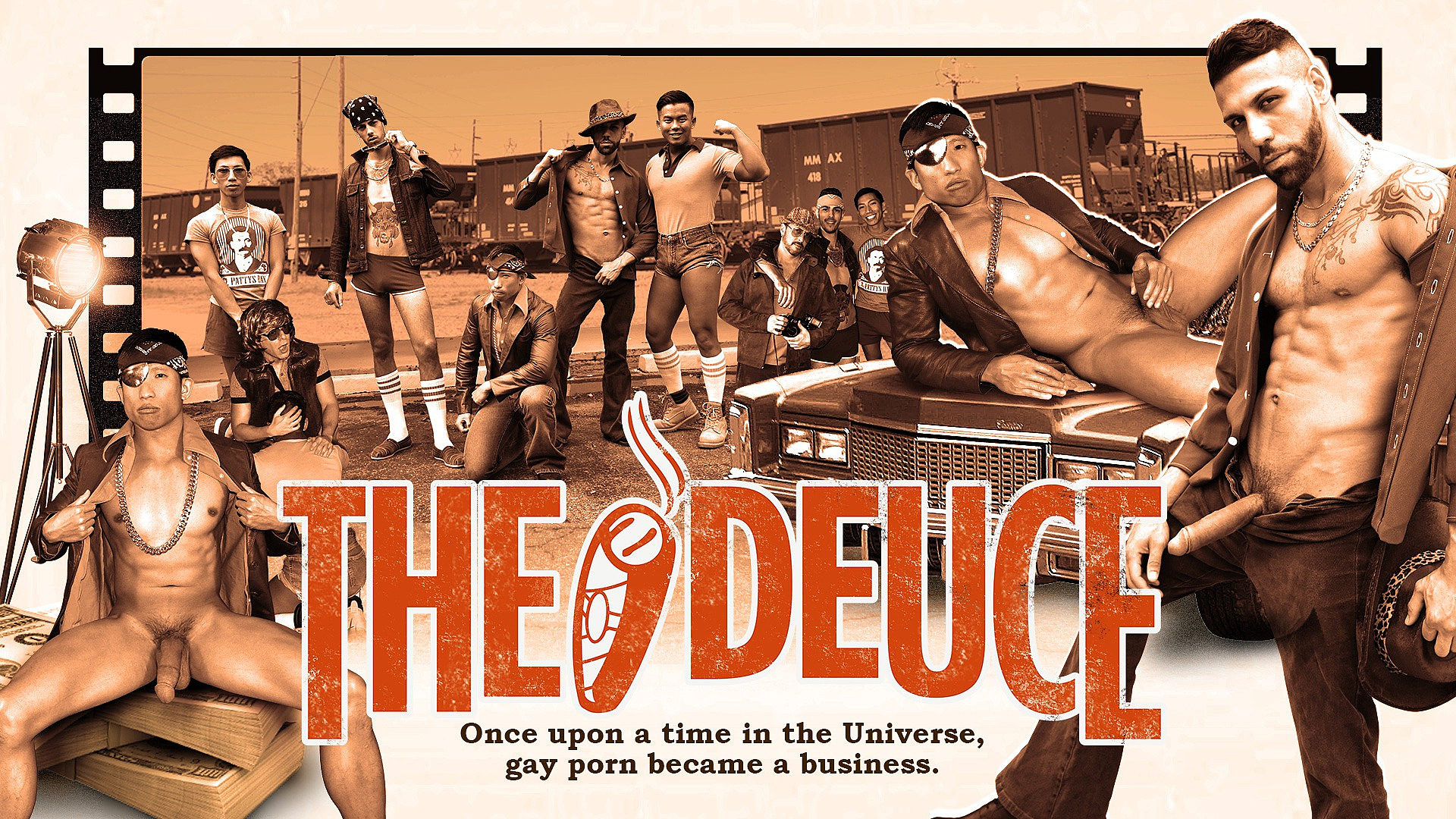 Based in the 1970's and inspired by the HBO James Franco drama "The Deuce," we explore what it would be like to hustle for cash if the same rules applied for men as they did for women during that time period. This is the biggest PeterFever production ever featuring Jessie Lee as the Grandmaster Pimp "China Gold" and "Silky Dick" (FX Rios) as his partner in pimpin,' and Alex Chu, David Ace and newcomer Bandit (Ari Nucci) as the hustlers. The movie starts with David and Alex hopping off the train in search of "China Gold." They run into a seasoned prostitute, known as Bandit, who leads them to the pimps. In order to become a part of their new adult talent agency, the guys need to get trained in the art of hustling and Bandit and Silky Dick are doing the "hard" training. Will David and Alex make enough money to please their pimps and profit from their work in pornography and hustling? Or will they need to take matters into their "own hands" or possibly asses? With mind blowing hot sex and a fun story to go along with it, this series brings us back to the 70's when porn was as sexy as it was entertaining. We hope you dig it!