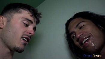 Hugo pulls out and lets Alon spit shine his cock and balls once more. He strokes his wet dick and lets his nuts dangle into Alon's insatiable mouth. Alon licks and worships Hugo front and rear as the hot lean rawfucker speeds up his dick beating. His jaw drops open as the load boils up from his nuts. When it geysers out it drenches Alon's face but mostly fills up his dickthirsty mouth. On the edge, Alon stands up and splatters out a creamy wad into Hugo's face.
