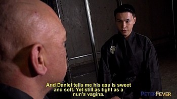 When Reitaro enters wise old Toranaka's quarters, reports that the barbarian prisoner sucks like a blowfish, and has an ass that's sweet and tight. Toranaka's obvious arousal at hearing that description spurs Reitaro to offer his services to the stiff-dicked leader. He falls to his knees to provide a deep juicy mouth and a pliant butt to Toranaka. Reitaro braces against the wall as Toranaka plows in with surprising vigor. The leader responds to his underling's kind offer with a hard raw screw that has Reitaro spewing his spooge and taking a sticky faceful. As they part. Toranaka orders him to find their best man to test the barbarian's prowess in the arts of "pillowing".