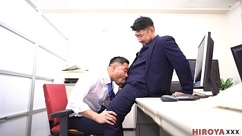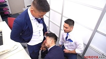 Another hot one from Hiroya from his extensive library of stories directed at you suit and tie fetish guys. New office employee Bao looks over and notices Rio's cock as they stand at the men's room urinals. Back at their desks that sets off the hottest of chain reactions, with suit and tied manager Hiroya joining in for all the extracurricular hijinks. Their threeway fuck gives Bao a hot welcome to the corporate world that ends with him covered with sticky loads and a big satisfied smile.