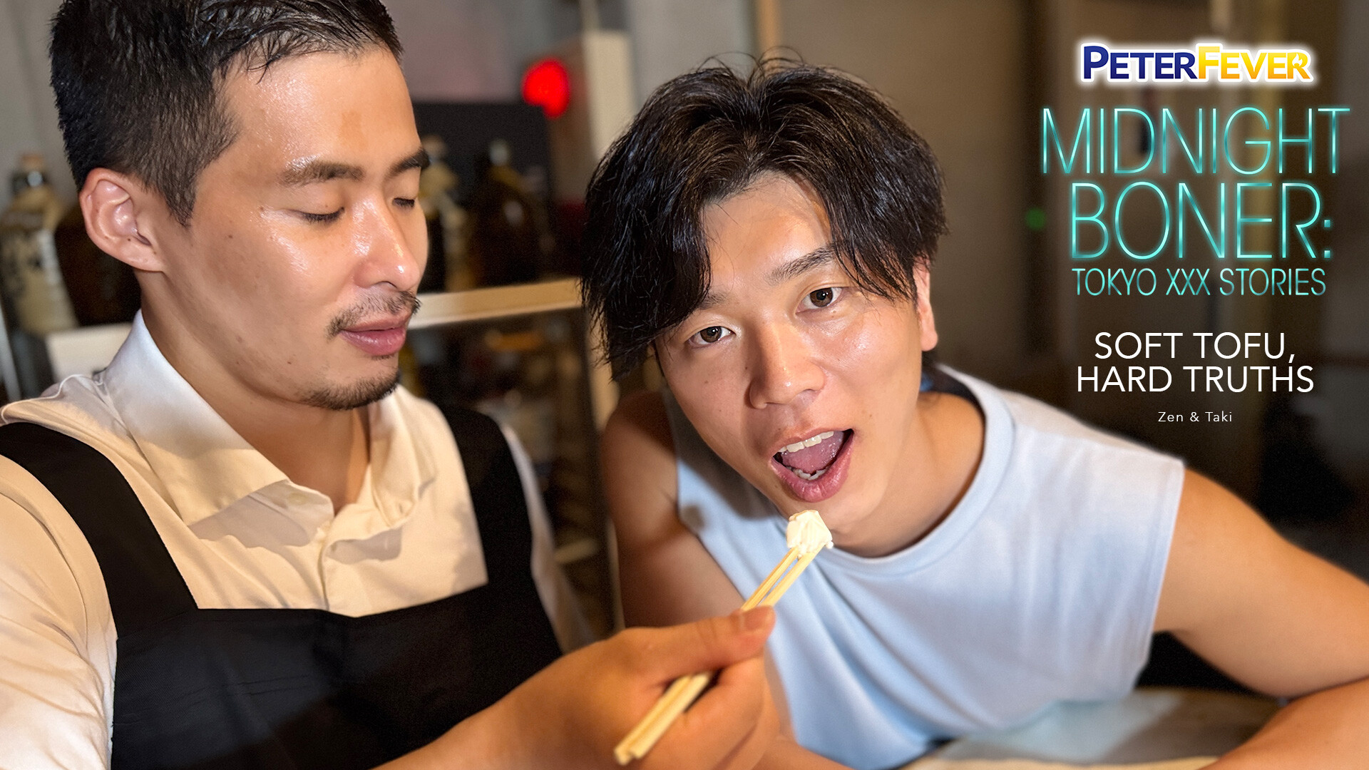 Handsome mustached Taki takes a seat at Chef Daddy's counter, in the mood for some soft tofu. A steaming saucy dish of thick tofu arrives with a pair of chopsticks and just as Taki digs in, Zen sits at the counter to praise his famous fan site. He wants to start a site of his own, and asks Taki to "show him the ropes". Taki needs a moment to think about going back to Zen's to shoot a scene, but soom is offering a taste of his tofu and a spicy kiss.
